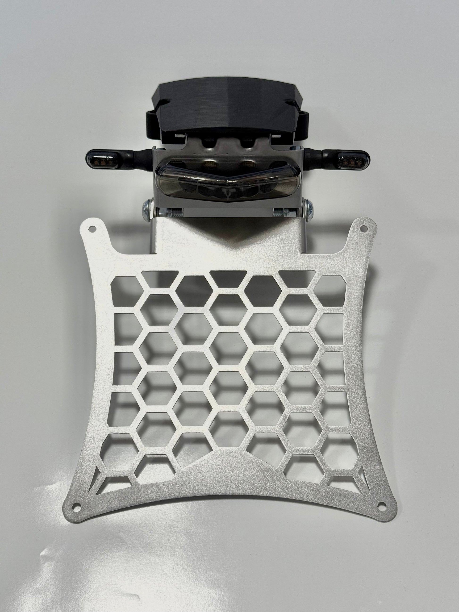 Il portatarga, nella sua versione senza accessori viene fornito privo di faretto posteriore, frecce direzionali e cablaggi, al fine di offrire al cliente la massima libertà nella scelta e nell'installazione dei componenti che meglio rispecchiano il proprio stile e le proprie preferenze.